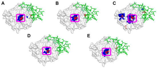 The localization of thiolactones (A)—HTL, (B)—C2-HTL, (C)—iBut-HTL, (D)—γ-thiobutyrolactone, (E)—Acetylhomocysteine molecular surface of the AiiA (colored gray) combined with PLD50 (shown as green sticks). Blue color indicates the atoms located within 4 Å of any thiolactones’ atom and the corresponding molecular surface of enzyme. Molecules of thiolactones are shown as red sticks. The entrances to the active sites of enzyme are highlighted with purple boxes.