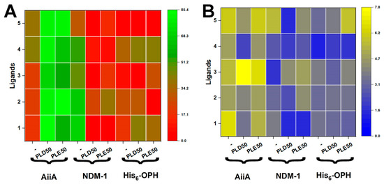 The area occupied by the molecules of investigated ligands (1 —HTL, 2 —C2-HTL, 3 —iBut-HTL, 4 —γ-thiobutyrolactone, 5-Acetylhomocysteine) near the active sites (A) on the surface of complexes of enzymes with hydrolase activity and polAA (A) and on total surface of the enzyme (B). The value of the surface area of the active sites of enzyme (A) and the value of the area of the total surface of complexes (B) were taken as 100%.