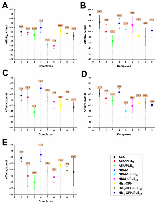 Mean value of affinity (kJ/mol) of investigated molecules (A)—HTL, (B)—C2-HTL, (C)—iBut-HTL, (D)—γ-thiobutyrolactone, (E)—Acetylhomocysteine) to the surface of complexes of enzymes with hydrolase activity and polyaminoacids.