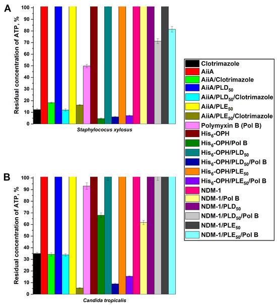 The antimicrobial activity of AiiA, NDM-1, and His6–OPH enzymes or their complexes with polyAA (PLD50 and PLE50) and their combinations with antimicrobial agents (clotrimazole or polymyxin B, which is an antimicrobial peptide with membranotropic action) was studied in relation to Gram–positive cells of Staphylococcus xylosus B-8725 bacteria and Candida tropicalis Y-2245 yeast cells (Figure 8). In this case, the antimicrobial efficacy of the studied samples on the cells of microorganisms was assessed by the residual concentration of ATP in the cells, determined by the method of bioluminescent ATP-metry [12,25].