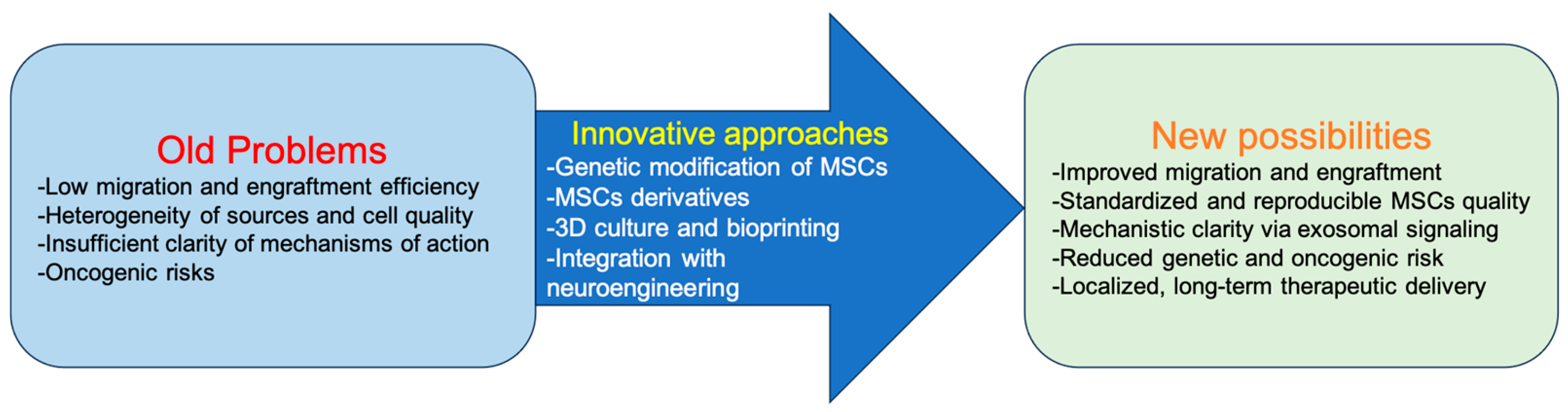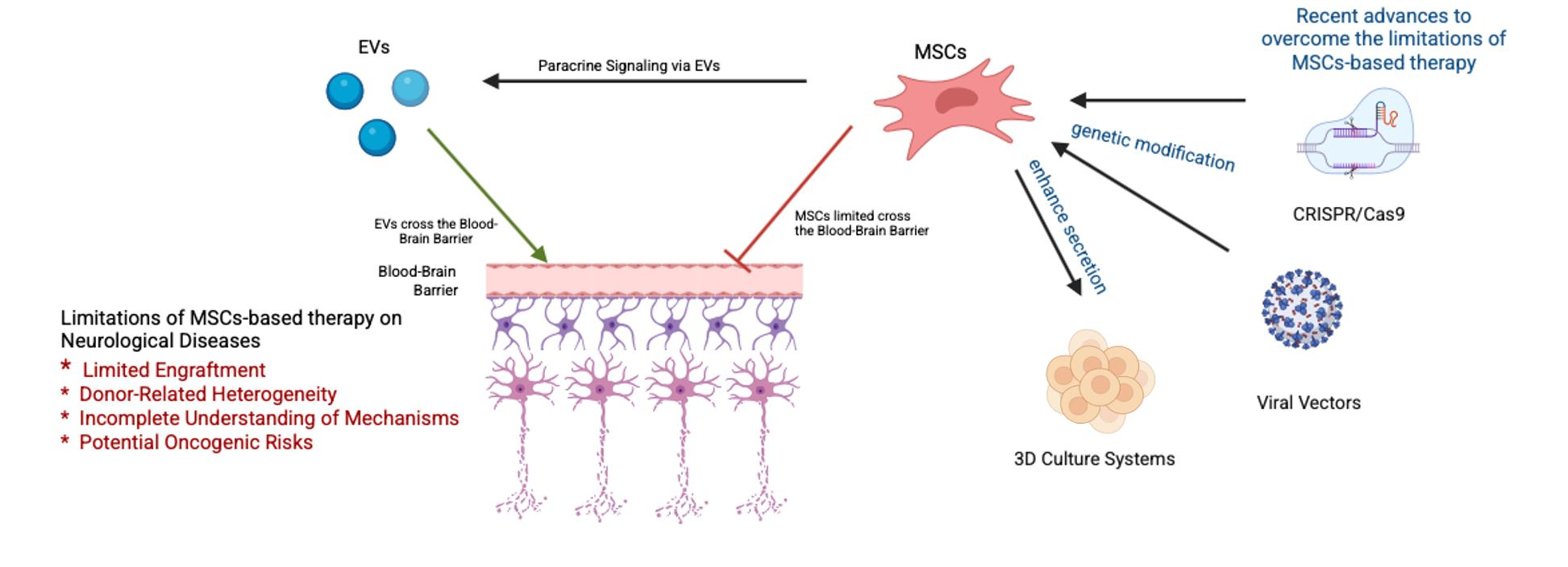 - Genetic modification of MSCs. Genetic engineering provides opportunities to enhance the therapeutic potential of MSCs. Introduction of constructs via CRISPR/Cas9, lentiviruses, or AAV vectors enables targeted upregulation of neurotrophic factors (Brain-Derived Neurotrophic Factor (BDNF), Glial cell line-Derived Neurotrophic Factor (GDNF), Nerve Growth Factor (NGF)), anti-inflammatory molecules (IL-10), or chemotaxis receptors (CXCR4)), thereby improving homing and engraftment [4,16,32,33]. Such modified MSCs show improved survival in the hostile microenvironment of the CNS and more efficient migration to injury sites [34,35]. Furthermore, the creation of regulatory MSC lines that induce therapeutic gene expression in response to microenvironmental signals (e.g., hypoxia or inflammation) represents a promising direction in genetic engineering. Selich et al. (2023) successfully developed the ECA7 promoter, which is activated by IFN-γ and induces IL-10 secretion in a mouse model of acute allergic syndrome. This approach could potentially be applied to a wide spectrum of pathological conditions [36].