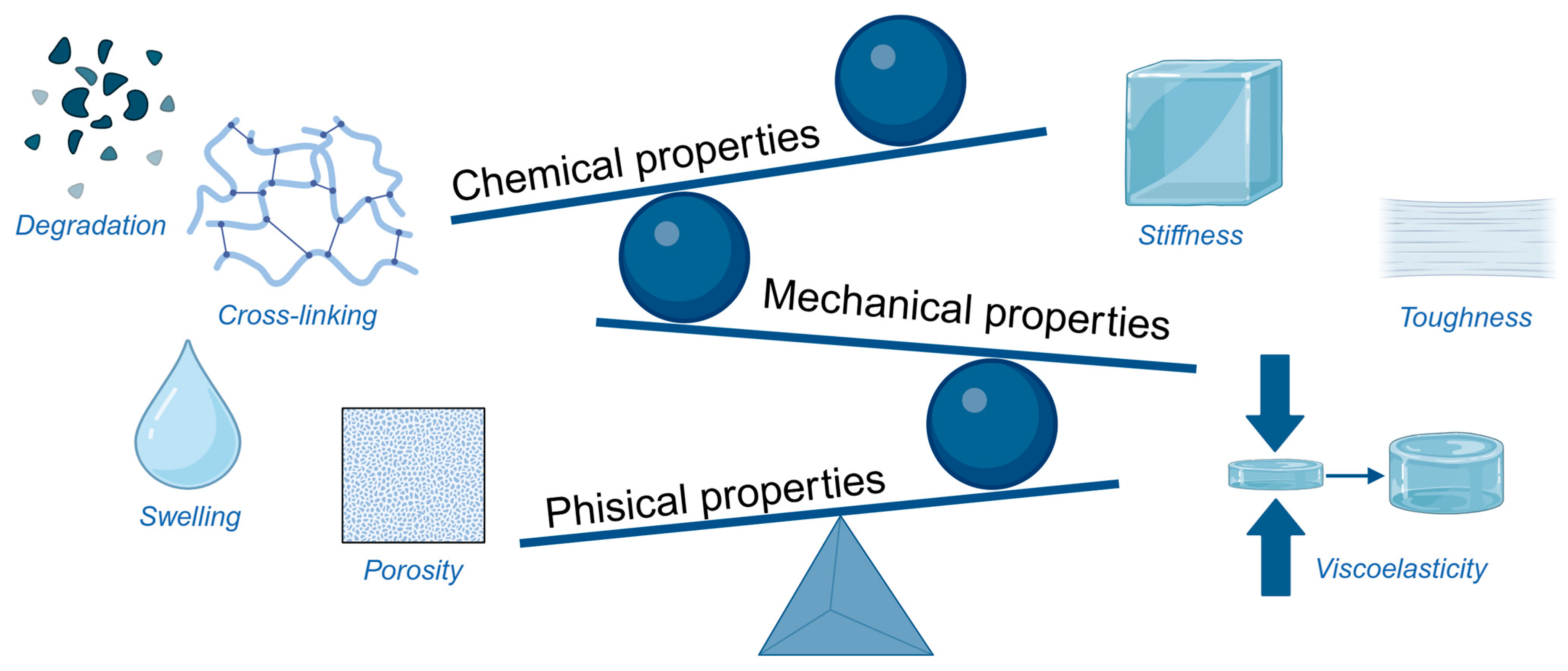 | Self-healing | Self-repair for irregular defects, reducing inflammation | Chitin, oxidised hyaluronic acid |