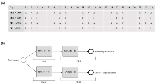 There were two separate study arms for this study: An acute branch where animals were sacrificed 48 h following final impact, and a chronic branch where animals were sacrificed 90 days following final impact (Figure 1). Using the random number generator function of Excel, mice were randomized to one of four treatment groups: control with vehicle (VEH + CON, n = 8), control with celecoxib (CEL + CON, n = 8), impacts with celecoxib (CEL + IMP, n = 8), or impacts with vehicle (VEH + IMP, n = 8). CEL was dissolved in saline and delivered at a dose of 50 mg kg−1 day−1, which is equivalent to previous mouse dosages. The vehicle groups received saline only. Vehicle or CEL were administered via subcutaneous injection, and were given for 14 days prior to the first impact and throughout the impact and testing schedule until the time of sacrifice of the acute groups. The body weight of each mouse was assessed before the commencement of CEL administration, weekly during mTBI administration and at time of euthanasia. There were no significant differences in weight between impacted and non-impacted groups at all time points (data not shown). Impacts or anesthesia for all groups were delivered across a 23-day span, on a rotation of three impact/sham days followed by two rest days (Figure 2A).