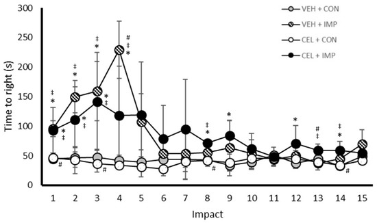 Time to regain righting reflex (seconds) following impact or sham control anesthesia. Values are reported as mean (± SD); * p < 0.05 difference compared with VEH + CON; ‡ p < 0.05 difference with CEL + CON; # p < 0.05 difference compared with CEL + IMP. N = 5 per group.