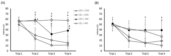 (A) Time to find the hidden platform (seconds) in the MWM at acute testing. (B) Time to find the hidden platform in the MWM at chronic testing. Values are reported as mean (± SD); * p < 0.05 difference compared with VEH + CON; ‡ p < 0.05 difference with CEL + CON; # p < 0.05 difference compared with CEL + IMP. N = 4–5 per group.