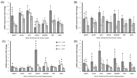 (A) The mRNA expression fold change relative to VEH + CON of genes in the cortex at acute testing. (B) The mRNA expression fold change relative to VEH + CON of genes in the cortex at chronic testing. (C) The mRNA expression fold change relative to VEH + CON of genes in the hippocampus at acute testing. (D) The mRNA expression fold change relative to VEH + CON of genes in the hippocampus at chronic testing. Normalized to Gapdh (± SD); * p < 0.05 difference compared with VEH + CON; ‡ p < 0.05 difference with CEL + CON; # p < 0.05 difference compared with CEL + IMP. N = 4 per group.