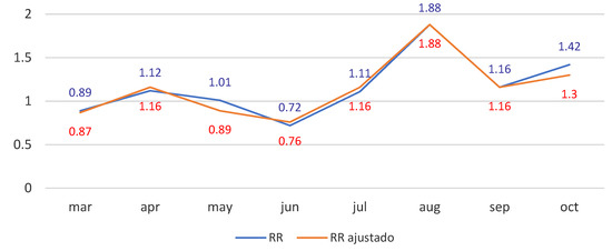 Table 4 lists the DBS cases and raw risk ratios registered in the months and years of the study. The last column gives the results for the contrast between each month of the year 2020 (exposed) and the corresponding mean of the preceding 5 years (unexposed). Figure 1 shows the trends of the RR of the original and of the seasonally adjusted series.