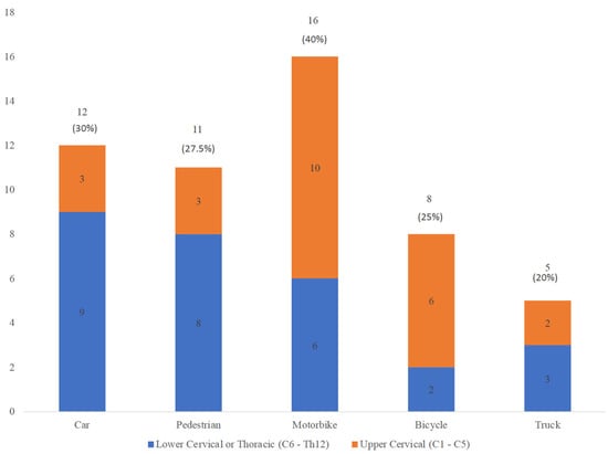 As for spinal cord injuries, traffic accidents were the leading cause in the United States at 48% [22,23,24,25]. An Italian study showed that falls accounted for 41% of spinal cord injuries, and traffic accidents accounted for 34% [26]. Patients with spinal cord injuries at the level C1–C3 had a 6.6-fold increased risk of mortality and 2.2-fold risk if they were injured at the C4–C5 level compared with patients with thoracic spinal cord injuries or lower [27]. Spinal cord injuries and transections can not only cause severe disabilities like paraplegia and tetraplegia, but they can also be a cause of death. The diaphragm is innervated by the phrenic nerves, which originate from the spinal roots of C3–C5. Thus, a spinal cord transection at the level of C3–C5 or above can cause respiratory failure. If bystanders do not start basic life support, this injury will lead to cardiac arrest within minutes, and emergency medical services often arrive too late. spinal cord injuries above C5, including transections, were found in all road users. The most affected group was one of the motorcyclists, in which one in every four cases (25%) sustained such an injury. This injury was also found in 15% of cyclists. A literature review also confirmed that motorcyclists are most at risk for severe spinal cord injuries, particularly upper cervical injuries, among all road users [28,29].