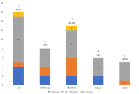 For pedestrians, injuries are usually divided into primary, secondary, and tertiary injuries. Primary ones occur at the first contact with the vehicle, like the bumper. Secondary ones happen because of the second contact with the vehicle, such as the windscreen. Tertiary ones are caused by the fall onto the street. The type of injury also very much depends on the speed of the collision. In low-speed accidents (up to 20 km/h), the patient is found in front or to the side of the vehicle or is run over. In medium-speed accidents (20–60 km/h), the pedestrian hits the hood of the car or its windshield. In high-speed accidents (60–100 km/h), the pedestrian is thrown into the air. In high-speed accidents, the contact with the windshield and consequent fall onto the ground often cause severe head injuries [14,15]. The results of this analysis showed that around 4 out 5 pedestrians had cranial fractures and 95% had traumatic head injuries. Subarachnoid hematomas were found in 80% of pedestrians involved in fatal incidents. Subdural and intraventricular hemorrhages were both found in 60% of pedestrians. This was the highest rate among all road users, and only cyclists had a similar amount of these injuries. Additionally, other studies show that pedestrians have the highest incidence of traumatic brain injuries [16,17]. Fifteen percent of cervical injuries, on the other hand, is the lowest rate among all road users. Spinal cord injuries, including transections, were found in 28% of dead pedestrians, and 7.5% involved the C1–C5 vertebrae. Thoracic injuries were a little less common than in car occupants (90% vs. 98%). Approximately, the study found rates of 18 percent for left and right lung lacerations, 30% for pericardial ruptures, and 12.5% for ruptures of the heart. Thoracic aorta lacerations occurred only half as often as in car occupants (20% vs. 40%). Abdominal injuries (55%) in pedestrians were less common than in fatal car accidents (73%). Liver lacerations occurred in 30% and splenic in 17.5% of cases; both values were the lowest among all road users. Approximately 38% had a fractured pelvis. Upper extremity fractures were much less common than lower ones (28% vs. 43%). Overall, it can be said that traumatic head injuries were more common in pedestrians than in car occupants, with thoracic injuries occurring a little less and abdominal injuries occurring far less. In pedestrians, traumatic brain injuries were particularly prevalent, but again, multiple injuries seemed to be the cause of death in most cases.
