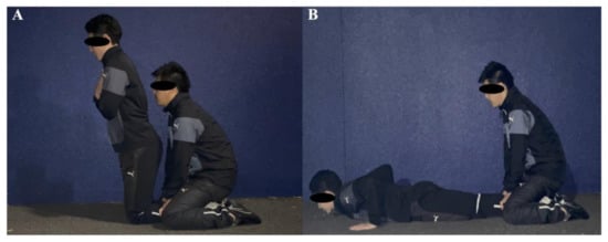 The Nordic hamstrings exercise. (A) Starting position, (B) End position of the hamstrings muscle strengthening program.