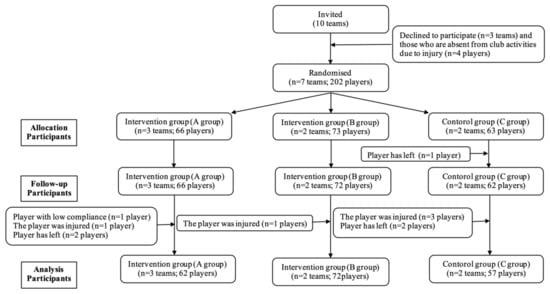 A total of seven high school soccer clubs (202 players) were enrolled in the study. The flow of the players through the phases of the study is shown in Figure 4.