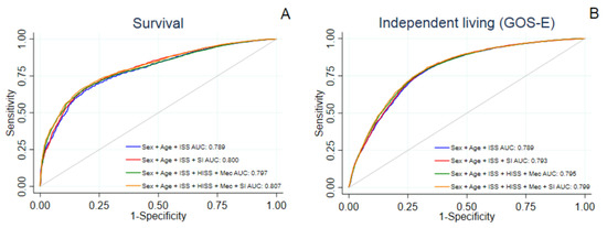 Calibration curves of models in the training dataset for (A) survival to hospital discharge and (B) independent living (GOS-E) 6 months post-injury. The calibration curve is a plot of the predicted versus the observed outcome in the training dataset. The 45° line represents perfect fit of the model. ISS, injury severity score; HISS, Head Injury Severity Scale; Mec; mechanism of injury; SI, shock index (heart rate/systolic blood pressure); AUC, area under the receiver operating characteristic curve; GOS-E, Glasgow Outcome Scale—Extended.