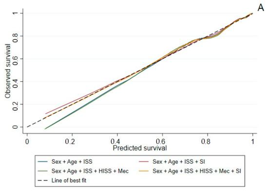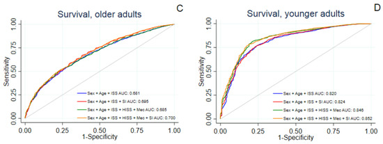 When analysing model performance in age groups, adding the SI to the VSTR model resulted in a significantly improved discrimination for survival in older and younger adults (Table 5 and Table 6). The survival discrimination of the prognostic models was poor in the older group (AUC ranging between 0.681 to 0.699) versus excellent in the younger group (AUC ranging between 0.820 to 0.852). The ROC curves for younger and older adults are presented in Figure 2C,D. All models in older adults achieved acceptable calibration using H-L statistics (Table 5), although the calibrations of models in younger adults were not acceptable (Table 6).