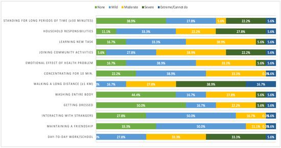 Among the 18 patients who had been discharged from the hospital, the median WHODAS 2.0 score was 16 (IQR: 9–24). Approximately one-third of patients reported severe or extreme difficulties in standing for more than 30 min (27.8%), completing household responsibilities (33.4%), or joining community activities (27.8%). None of the patients reported they had “no difficulties” in their day-to-day work/school or to walk more than one kilometer. The median number of days in the past 30 days in which the patient experienced difficulties with one or more of the listed activities was 25.5 days (IQR: 15–30). The distribution of responses for the WHODAS 2.0 questionnaire items are shown in Figure 1.