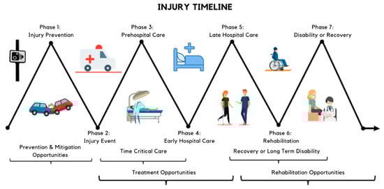 Globally, injury is a public health issue causing physical, psychological, and functional problems for affected individuals [,]. Injury causes 9% of the world’s mortality [], accounting for 5.8 million deaths yearly []. Alongside the development of road rules legislation, vehicle safety enhancements, public behaviour change campaigns, and law enforcement, improvements in trauma care systems including trauma response and injury prevention programs have driven a reduction in the trauma burden over the last two decades [,,,,]. This evolution of systems ensures a clear pathway of care for patients from the point of injury to the final phase of rehabilitation through centralising trauma resources and standardised treatment approaches (Figure 1). The fundamental goals of the system are to reduce traumatic injury-related mortality and improve patients’ health-related quality of life (HRQoL). A trauma system consists of different essential components in the prevention of and response to an injury event, including the prehospital response, in-hospital care, rehabilitation care, and injury prevention []. Different phases of care, reflecting the structure and processes of trauma care systems, are summarised in Table 1 [].