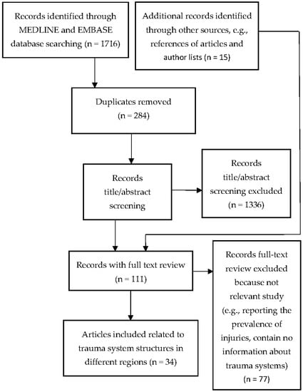 After the abstract, title screening, and full text reading processes were completed, 34 studies that had information about the characteristics of the trauma care system in which the research was conducted were included. Articles described systems in seven regions: the North America, Latin America, Europe, Asia and Middle East, Oceania, and Africa [,,,,,,,,,,,,,,,,,,,,,,,,,,,,,,,,,]. While all articles provided some information about the trauma system, descriptions were not comprehensive and there was little consistency. Therefore, eight prehospital emergency medical service providers’ annual performance reports were reviewed to support more detailed and comparable descriptions to be presented [,,,,,,,]. Detailed examples are from Oregon and Northern Ohio, US; British Columbia and Quebec Provinces, Canada; London, United Kingdom (UK); Emilia-Romagna, Italy; Hong Kong, China; Victoria, Australia; and Western Cape Province, South Africa.