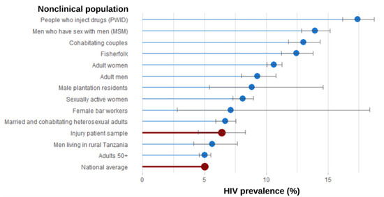 The HIV prevalence among our sample is between 5.02% (tested) and 6.25% (self-report), while the national average is 4.8% (Figure 3 and Figure 4). Injury patients in our sample had a lower HIV prevalence than adult women; fisherfolk; cohabitating couples; men who have sex with men (MSM); people who inject drugs (PWID); adults who received TB treatment within two years; pregnant women attending antenatal care clinics; women screened for cervical cancer; patients with a neurological disorder admitted to medical wards; hospital patients; febrile adult patients; patients who completed 20–24 weeks of treatment; patients on treatment for TB; VCT clients, ANC attendees, blood donors, and CTC patients; patients treated with levofloxacin as part of a regimen for MDR-TB; suspected TB patients; PWID attending methadone clinics; confirmed TB patients; HCV-seropositive patients enrolled in the local opioid substitution treatment center; and presumptive pulmonary TB patients.