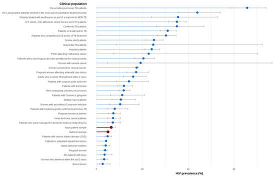 Comparing HIV prevalence estimates of clinical population groups identified via systematic review with ED injury patient sample and national average.
