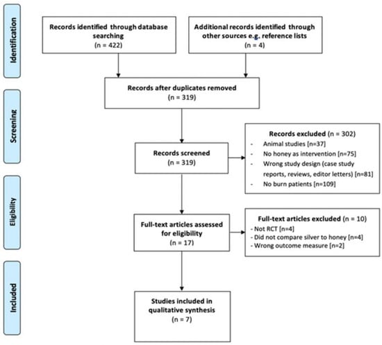 The initial search from three databases yielded a total of 422 results, with a further four studies identified from additional records. Following the removal of duplicates, 319 studies were extracted and imported into the Covidence database for screening. At this stage, 302 studies were excluded based on the inclusion and exclusion criteria, resulting in 17 for full-text assessment. A further 10 studies were then excluded following full-text analysis and hence seven RCTs were included in this systematic review. File S2 provides a list of full-text exclusions (n = 10). The full PRISMA flowchart is provided in Figure 1.