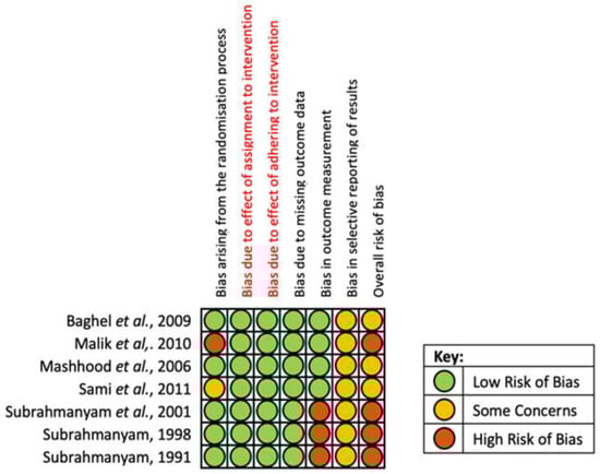 Overall, three studies were found to have some concerns, whilst four studies were evaluated to have a high risk of bias. Regarding bias due to randomisation, Sami et al. [28] had some concerns due to utilising non-probability consecutive sampling whilst Malik et al. [25] had a high risk of bias due to inadequate allocation concealment. Only Malik et al. explicitly described the blinding of patients and nursing staff; the increased risk of performance bias in other studies was mitigated by their use of objective primary outcome measures. However, the three studies by Subrahmanyan et al. [27,29,30] assessed the primary outcome via an inherently subjective interpretation of ‘complete healing’; resulting in an assessment of high risk of bias for outcome measurement. All studies failed to include an appropriate pre-specified plan for data analysis and reporting. Therefore, it was not possible to determine the level of reporting bias.