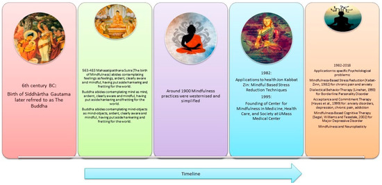 Mindfulness-based practices have become globally prevalent over the past decade. However, as supported by Fossas [12], research indicates that the origins of mindfulness meditation practices extend approximately 2500 years into the past, and they have firm origins in Hinduism and Buddhism. The diagram (Figure 1) below provides a timeline which indicates the transition of the clinical application of mindfulness as an intervention from its origins to the present application of the practice.
