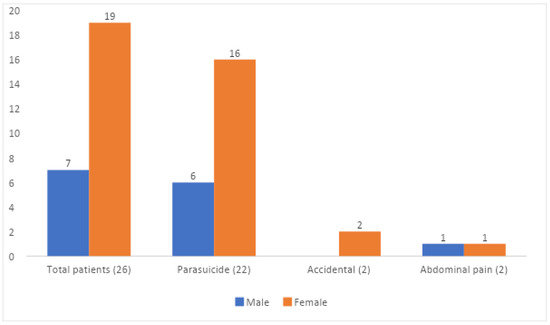 There was no significant difference in suicidal intention between genders; 16/19 females (84.2%) and 6/7 (85.7%) males; p = 0.60 (Figure 1). The average age for female parasuicide was 20.4 years (14–31 years) and males, 23.6 years (21–41 years).