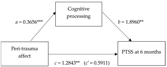 Simple mediation model for the relationship between peri-trauma affect and PTSS as mediated by cognitive processing. ** p < 0.01; *** p < 0.001.