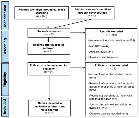 A total of 458 studies were obtained from the three database searches, and an additional 15 studies were identified through reference screening and searching Google Scholar. These studies’ titles and abstracts were screened, and 386 were subsequently excluded. Duplicates were then removed from the remaining 87 studies, leaving 31 at the end of the screening phase. Full texts were obtained, when possible, for the remaining 31 studies, and a further 21 were excluded due to a lack of conformity to the inclusion and exclusion criteria. These were excluded for the following reasons: the intervention and/or control were inappropriate; absent relevant inflammatory marker results or inappropriate collection times; absent mean results with CIs; the journal was discontinued, thus, the article was absent; and the inclusion of diabetes patients. The remaining 10 studies [16,19,24,28,29,30,31,32,33,34] were all included in the systematic review and meta-analysis. A PRISMA flowchart detailing the study selection process is provided in Figure 1.