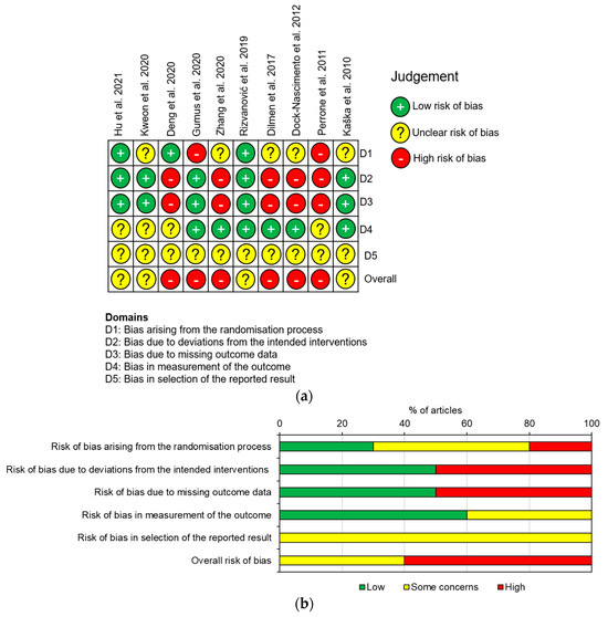 RoB of the included RCTs according to the RoB2: (a) demonstrates the RoB of each individual study; (b) demonstrates the overall RoB for all the studies [16,19,24,28,29,30,31,32,33,34].