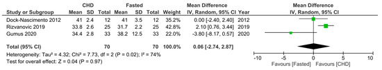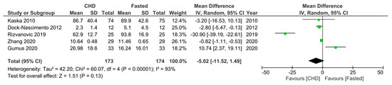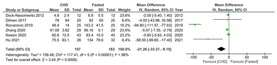 Forest plot to show 10–24 h postoperative CRP levels (mg/L) in fasting patients and those who consumed a CHD 2 h preoperatively [16,30,31,33,34].