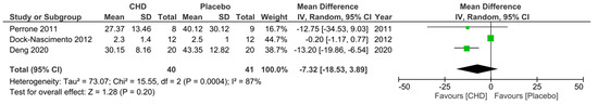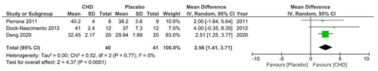 Forest plot to show 10–24 h postoperative CRP levels (mg/L) in patients who consumed a CHD and PD 2–3 h preoperatively [24,29,33].