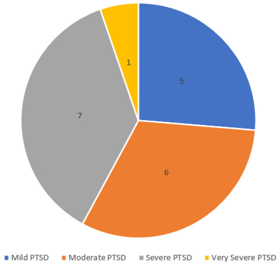 Eleven participants met DSM-5 (APA, 2013) diagnostic criteria for PTSD, and eight did not. Participants were ordinally categorized into four PTSD severity levels. Figure 1 shows participants’ categories: severe (n = 7), moderate (n = 6), mild (n = 5), and very severe (n = 1). For the purpose of this data analysis, very severe and severe categories were combined. Participants were also dichotomously divided as non-PTSD and PTSD, as defined by the PSS-I (see data diagnostics).