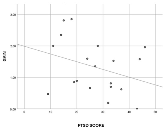Results of a point biserial Pearson correlation indicated there was a statistically significant medium negative correlation between PTSD diagnosis and resource gain (r(17) = −0.42, p = 0.039, one-tailed). A strong hypothesis of directionality was assumed; therefore, a one-tailed correlation analysis was utilized.