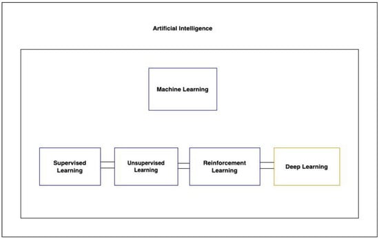 Showcases the hierarchy of artificial intelligence techniques, highlighting the relationships between AI, machine learning, its types, and deep learning.
