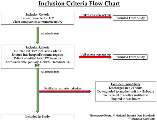 This study specifically looked at patients admitted to the ICU from the emergency room (ER) at PARMC due to traumatic injury. Our analysis included patients who were admitted from 1 January 2019 to 31 December 2021, and patients were selected using inclusion criteria outlined by the National Trauma Data Standard (NTDS). ER patients were first entered into the trauma registry if they fulfilled NTDS inclusion criteria. Our study then selected patients who were recorded in the trauma registry and were subsequently admitted to the ICU. Patients meeting these criteria were identified in the hospital’s trauma registry, a database that provided detailed information including demographics, mechanisms of injury, and patient outcomes. In total, 877 patients met the criteria for our analysis (Figure 1).