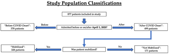 The time period for data collection in our study encompassed the COVID-19 pandemic and the shutdowns that followed in its wake. Patients were divided into two groups: “before COVID onset” (n = 378) and “after COVID onset” (n = 499), meaning after the onset of COVID-19 (Figure 2). To demarcate these two groups, the threshold date for the COVID-19 pandemic was defined as 1 April 2020, with patients admitted to the ICU on or before 31 March 2020 classified as “before COVID onset” and those admitted on or after 1 April 2020 as “after COVID onset”. Any patients who were discharged less than 24 h after admission, downgraded to another unit less than 24 h after ICU admission, transferred to another institution, or who expired less than 24 h after admission were not included in the patient group (Figure 1). Analyses were then performed to look for differences in patient and injury characteristics as well as changes in care, such as PT consultation, in the “before COVID onset” and “after COVID onset” settings. A secondary analysis was eventually conducted to determine patient characteristics and outcomes within the “after COVID onset” group that were mobilized (Mobilized) or were not mobilized (Not Mobilized) (Figure 2).