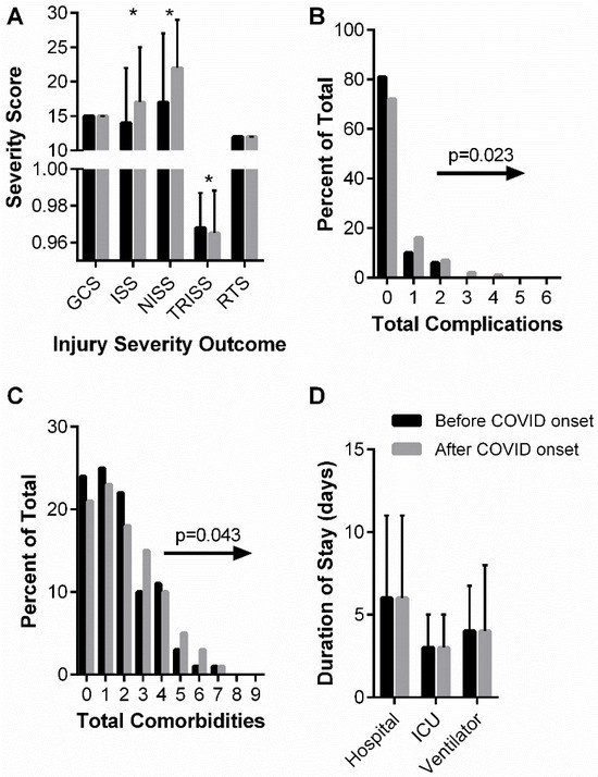 “before and after COVID onset” patient injury severity (A), cumulative complications (B), cumulative comorbidities (C), and hospital durations (D). (A) Glasgow Coma Score (GCS), Injury Severity Score (ISS), New Injury Severity Score (NISS), Trauma Score and Injury Severity Score (TRISS), and Revised Trauma Score (RTS) are shown as median and interquartile range. Data analyzed using Mann–Whitney test with * representing statistical difference between groups (p < 0.05). (B) Chi-squared analysis of distribution shifts of total patient complications between “before COVID onset” and “after COVID onset” cohorts. Statistical p-value and distribution shift direction are indicated. (C) Chi-squared analysis of distribution shifts of total patient comorbidities between “before COVID onset” and “after COVID onset” cohorts. Statistical p-value and distribution shift direction are indicated. (D) Hospital, ICU, and ventilator durations are shown as median and interquartile range. Data analyzed using Mann–Whitney test.