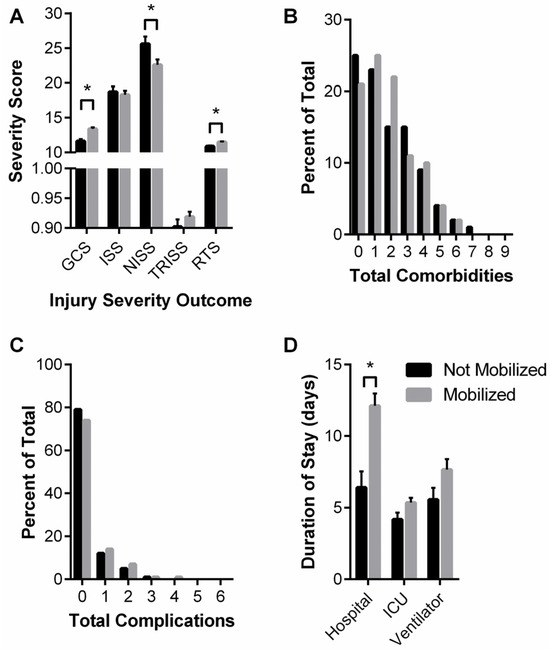 In regard to patient injury severity, the proportion of mobilized patients classified as severely injured was not statistically different from the proportion of patients not mobilized (~58%); however, mobilized patients had greater GCS and RTS scores and lower NISS scores (Figure 4A). GCS is a predictive coma score such that a “15” is normal and lower scores are associated with a greater likelihood of coma, vegetative state, and ultimately death. The RTS is a trauma score that correlates statistically with greater survival. There were no significant differences between patient groups for total comorbidities presented in the ICU nor total complications experienced within the ICU (Figure 4B,C).