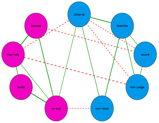 The undirected network. The green lines are positive associations; the red lines are negative associations. The thickness of the line is related to the strength of the association. Purple nodes (the circles) are PTSD symptom clusters; blue nodes are facets of mindfulness.