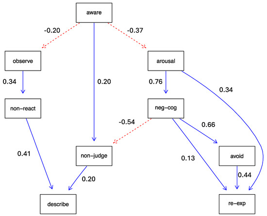 Figure 2 provides a graphical representation of the directed acyclic graph, and Table 2 provides the strength of each association (how often it appeared in the network), the direction (how often that specific direction appeared compared to the revers), and the regression coefficient for that association. Between PTSD and mindfulness, there were two predictions: First, greater scores in the Awareness facet of mindfulness predicted less PTSD symptom cluster E (Alterations in Arousal and Reactivity) b = −0.37 (strength = 0.93, confidence = 0.501). Second, greater PTSD symptom cluster D (Negative Alterations in Mood and Cognitions) predicted lower scores in the Non-judging mindfulness facet b = −0.54 (strength = 0.98, confidence = 0.79).