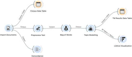 The data analysis plan contains seven steps. First, topic models ranging from = 2 to = 10 are produced to explore different levels of thematic granularity. Second, the optimal number of topics () is determined based on a combination of criteria, including low log perplexity, high topic coherence, and meaningful levels of detail. Third, LDAvis visualizations are used to interpret and differentiate between topics, leveraging the preset relevance parameter (λ = 0.6) for balanced interpretation. The complete Orange workflow file is presented in Figure 1. Fourth, the results from the Topic Modeling and LDAvis widgets are submitted to generative AI models to create preliminary labels for each topic. These models have been shown to be effective for topic labeling [29]. The specific approach used was multi-persona prompting [30]. The text of the prompt is available on the project’s website: https://osf.io/edvrz/. Fifth, the AI-generated labels are revised to ensure accuracy and clarity in light of the context of CISD/M discourse. Sixth, the fourth and fifth steps are repeated in an iterative manner to identify the topic structure most representative of the academic discourse on CISD/M. Seventh, logs documenting the use of generative AI, additional visualizations, and supplementary materials are made available for readers to inspect on the project’s website: https://osf.io/edvrz/.