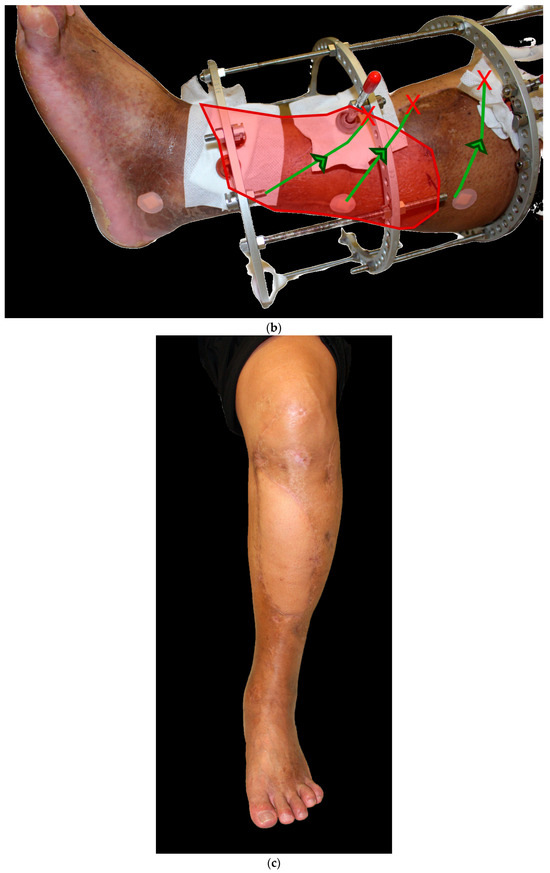 Figure 2. (a) Patient 2 sustained a left open tibia fracture (Gustilo 3B) after a road traffic accident, with a soft tissue defect of 21 × 8 cm in size. The fracture was stabilized initially with external fixation. There is a linear flow of lymphatics (green line) at the anteromedial leg (i.e., anteromedial lymphatic tracts not disrupted); (b) 3 months after LIFT, Patient 2 still experienced swelling and tightness of the affected leg, especially at the lateral aspect, with ICG lymphography demonstrating dermal backflow (red shaded area). As the ring fixators were in situ for 4 months, CDT (which is the standard post-operative treatment 1 month after LIFT to promote lymphatic flow through the reconstituted lymphatics) could not be started for the patient post-operatively. Lymphatic channels (green lines, with arrows denoting direction of flow) at the lateral lymphosome were disrupted (red crosses) by the injury site, resulting in dermal backflow (red shaded area). To note, the patient also had dry and flaky skin in addition to limb swelling; (c) 18 months after LIFT, with resolution of PTL. Lower limb volume reduced by 13.7% and LeQOLis scores improved from 57 to 22. Improvement in skin quality is also visible; (d) 18 months after LIFT, with resolution of PTL. Fluorescent dye was injected laterally (where channels were previously disrupted) and can be seen flowing medially (green arrows) into the LIFT (dotted blue lines) during ICG lymphography—the previously disrupted lymphatic channels at the injury site have reconstituted.