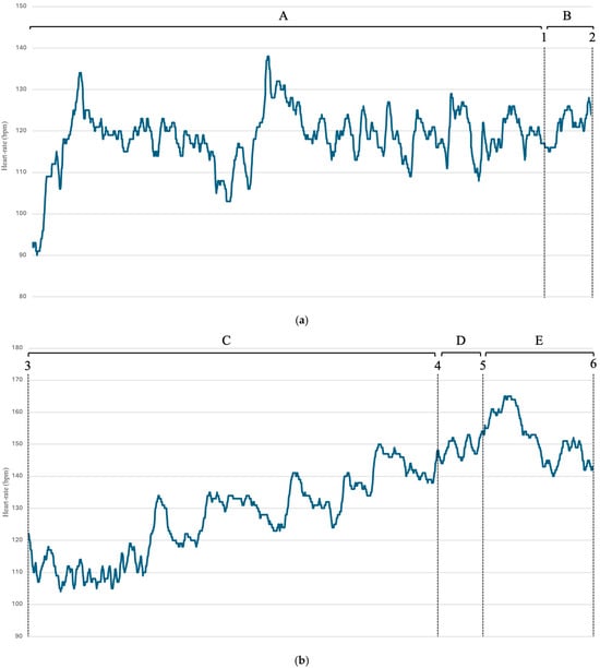 HR monitoring from the hotel until just before the start of the first fight. (a) Legend: 1 = leaving the hotel; 2 = arrival at the bullring; A = dressing at the hotel; and B = trip to the bullring. (b) Legend: 3 = arrival of the bullfighter at the bullring; 4 = start of the “paseíllo”; 5 = end of the bullfight and start of the pre-fight; 6 = start of the first bullfight; C = Pre-bullfight; D = ”paseíllo”; E = before the first fight.
