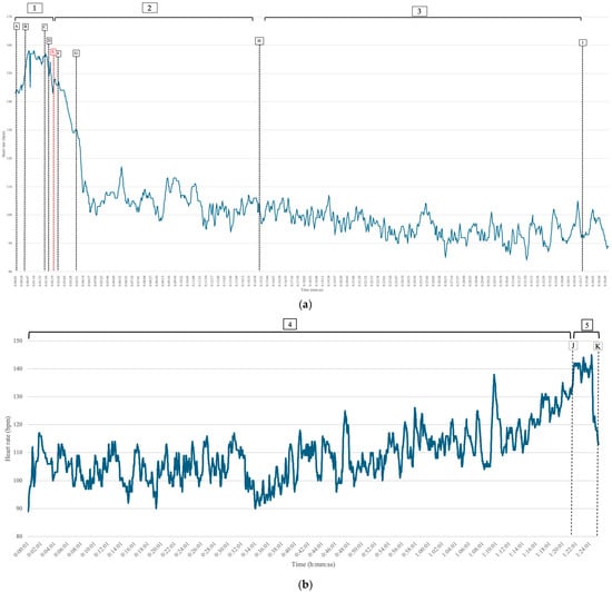 HR registration data during the fight with the first bull, when the bull gored the bullfighter, until the start of the second fight after surgery. (a) Legend: 1 = first fight; 2 = goring and pre-surgery; 3 = surgery; A = the bullfighter walks to the “puerta de toriles”; B = the bullfighter kneels in front of the “puerta de toriles”; C = the bull enters the bullring; D = the bullfighter makes a “larga cambiada” to the bull with the capote; E = the bullfighter receives the goring; F = the bullfighter is assisted by his assistants to get up from the ground after the goring; G = the bullfighter is taken to the infirmary by his assistants; H = the surgery begins; and I = the surgery ends. (b) Legend: 4 = post-surgery period; 5 = pre-second fight moment; J = the bullfighter returns to the bullring alley; and K = the second fight begins. The letter E is highlighted in red to indicate the exact moment of the goring, which represents the critical traumatic event and serves as the reference point for interpreting the subsequent HR response.