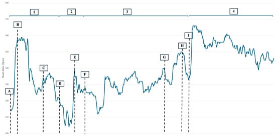 FC registration data from the beginning of the second bullfight until the bullfighter left the bullring after the second bullfight had ended. Legend: 1 = stage 1; 2 = stage 2; 3 = stage 3; 4 = post-bullfight; A = the bullfighter walks towards the “puerta de toriles”; B = the bullfighter waits for the bull to come out into the bullring; C = the bullfighter fights the bull; D = end of the first part and beginning of the second part; E = first flag; F = second flag; G = pre-fight with the muleta; H = fight with the muleta; and I = bullfighter takes the sword and final stage.