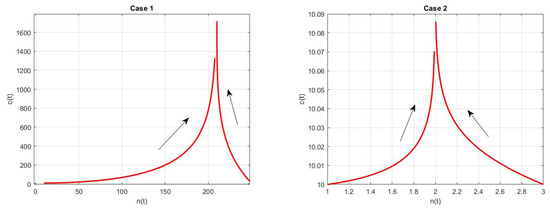 - As in the first numerical case, we consider the example in [6], p. 163, withwhich are values for a nuclear reactor involving the thermal fission of uranium-235 in [3]. For these values, the deterministic model (6) has a fixed point at and its Jacobian has eigenvalues of and , so the fixed point is unstable. In Figure 1, we plot the numerical solution with Matlab for and , . (We refer to [7,8,9,10] for a review of the numerical solutions of ODEs).