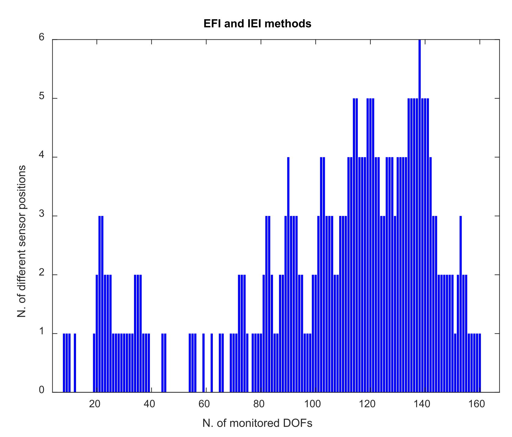 The IEI method can be used in combination with the backward sequential sensor placement (BSSP) algorithm: initially, the full configuration (n DOFs monitored) is assumed as a reference and then it is compared to all the possible configurations with one sensor less (n − 1). The configuration with the lowest IEI is chosen and used in the following iteration. The procedure is continued up to the number of target sensors N0 is reached.