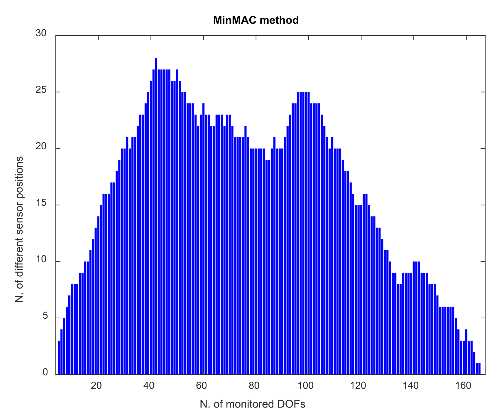 Figure 10 shows the average number of different sensor positions over 100 measurements as a function of the number of monitored DOFs using the MinMAC method with an initial sensor set formed by a single vertical sensor in node 84. For this method, the number of different positions is much higher compared to the other three methods all over the selecting process, which means that the MinMAC method is the least robust method to the measurement errors.
