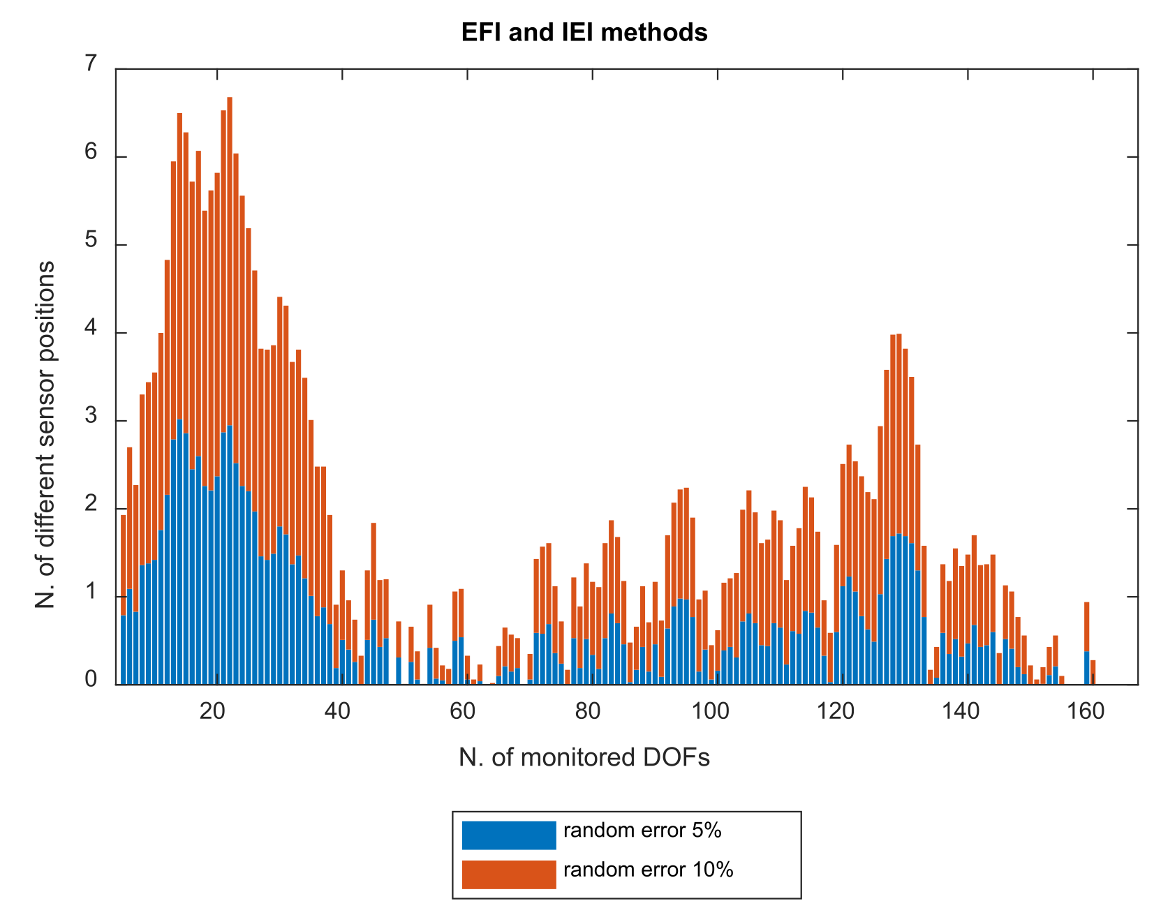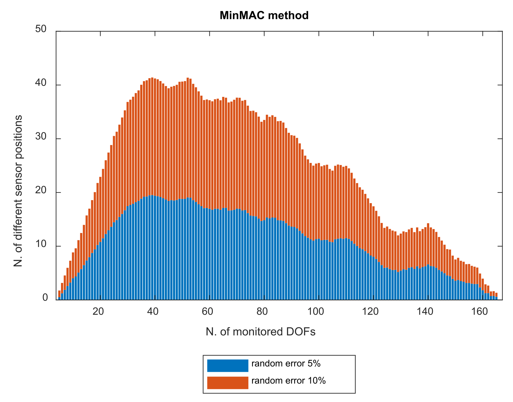 Figure 8 shows the average number of different sensor positions over 100 measurements as a function of the number of monitored DOFs using the MKE method. For the 10-sensors set and a random error of 10%, the average number of different sensor positions reaches its maximum with 2.42 different sensors. This value is lower than five, which is the maximum number of different positions due to the model error (see