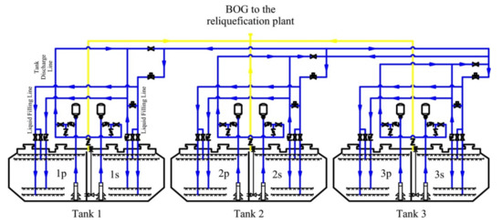 The individual components are brought on board during loading. Tank No. 2 carries liquefied propane at a temperature of –40.1 °C, and tanks No. 1 and No. 3 carry liquefied butane at a temperature of −4.7 °C (Figure 2). Two units that operate on a two-stage mechanical compression cycle with incomplete intermediate cooling and coil in the cargo economizer are used to cool down propane. Butane is cooled by one unit, which operates on a two-stage mechanical compression cycle without subcooling or intercooling.